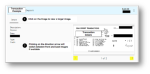 2.Locate the desired transaction. Click on the transaction to expand the details and view the image. Please note that some images may be a scanned bank facsimile and not the actual image. Clicking on the image will load a larger image, and the arrows will switch between front and back of the image if available.
